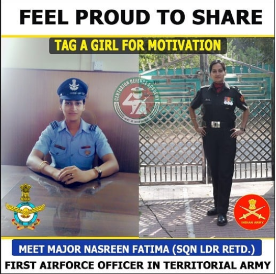 1. Major Nasreen Fatima, Squadron Leader (Retd.), the first lady Officer from the Indian Air Force in the Territorial Army. She is commissioned in Indian Air Force as a Short Service Commissioned Officer in Education Branch for a tenure of 10 years and currently working as an Academic Head in Centurion Defence Academy, one of the renowned defence institute in India offering maximum numbers of Officer level selection each year.