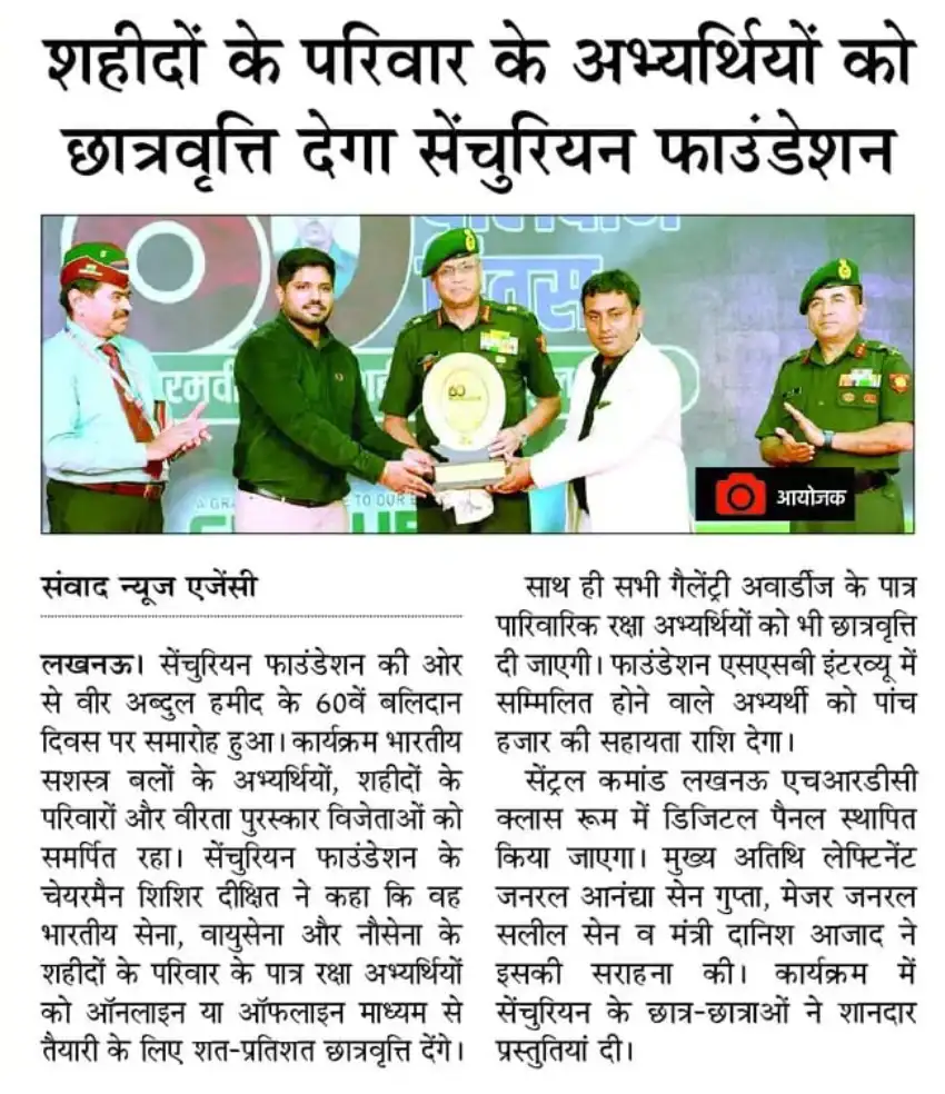 परमवीर चक्र विजेता वीर अब्दुल हमीद के ६०वें बालिदान दिवस पर सेंचूरियन फाउंडेशन ने भारतीय सशस्त्रबलों, शहीद परिवारों और वीरता पुरस्कार विजेताओं के लिए ऐतिहासिक घोषणाएँ कीं |