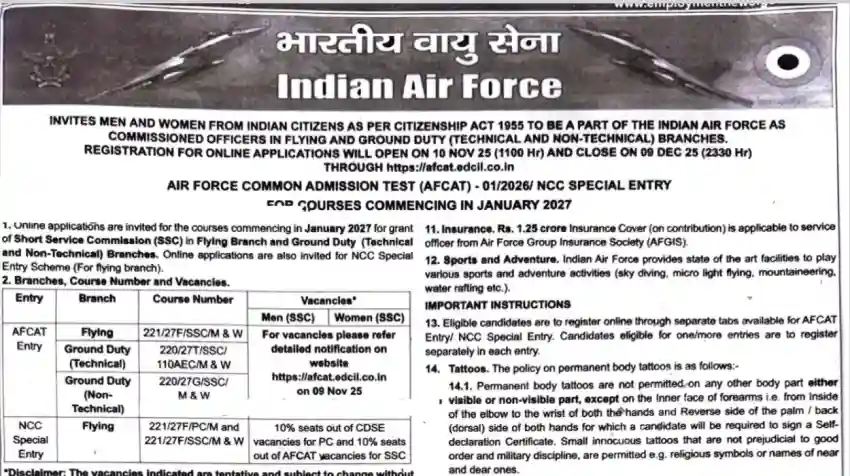 AFCAT 1 2026 Notification Out - Application Starts from 10 November