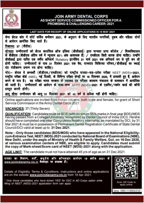 Only those candidates who have ticked ‘YES’ for SSC in AD Corps option while filling of NEET (MDS)-2021 application form can apply.